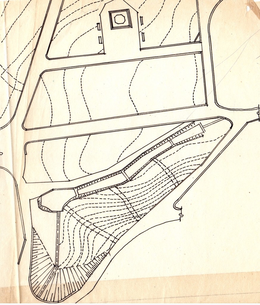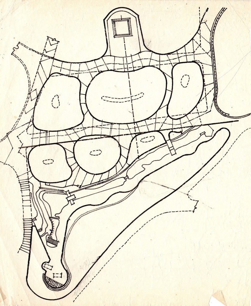Проект був опрацьований у тогочасній прогресивній стилістиці інтернаціонального модернізму. У ландшафтній архітектурі це проявлялось у поєднанні прямокутних форм і площин із природним рельєфом та імітацією “більшої натуральності” ландшафту такими, як кам’яні валуни, каскад водойм, нерегулярність зелених насаджень.