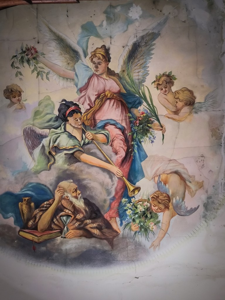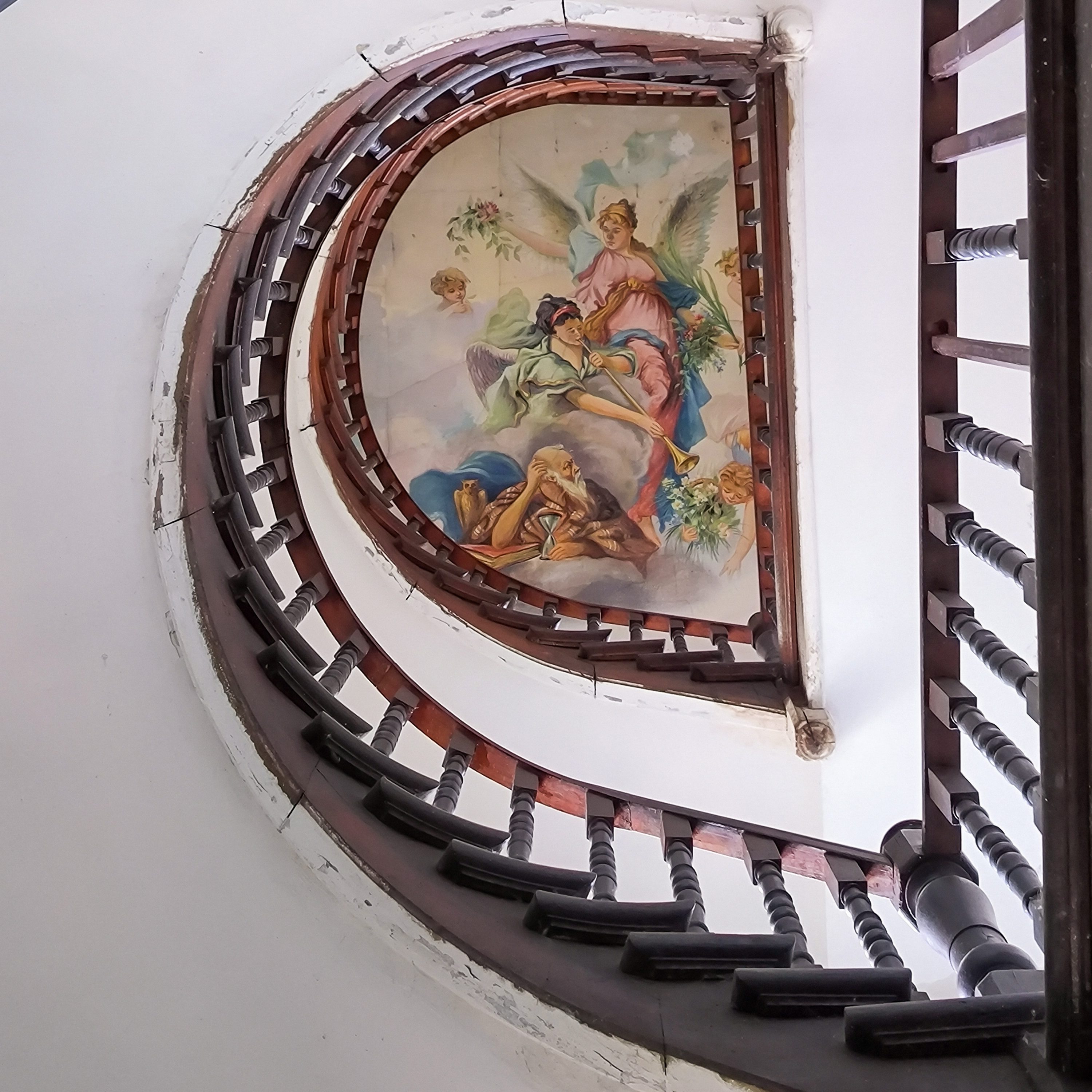 Та повернімося до розпису зі св. Єронімом. Він прикрашає стелю над підковоподібною сходовою кліткою у чиншовій кам’яниці на вул. Опільського.