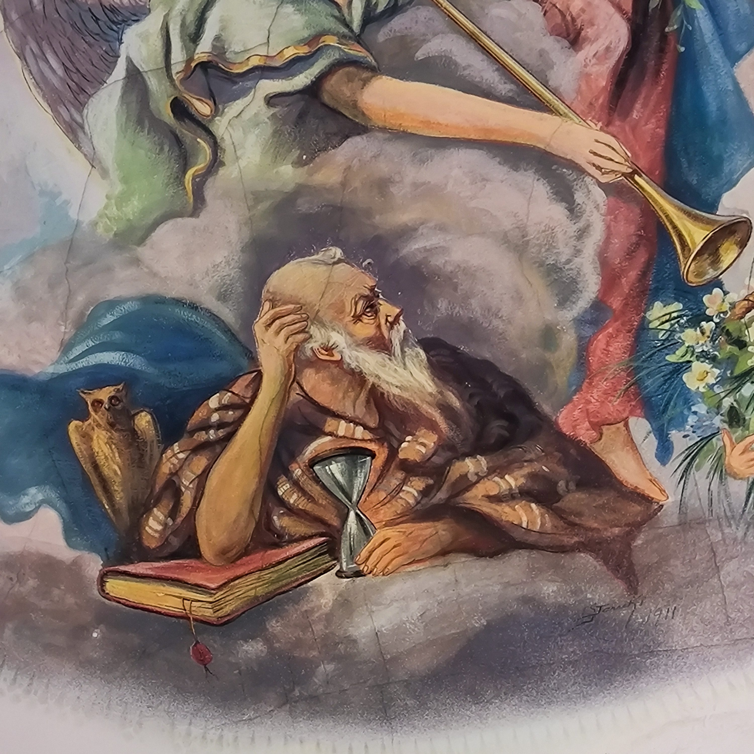 На зображенні вчений муж – про вченість свідчить книга та сова поряд – відволікся від своїх студій на звук сурми. Прекрасна крилата жінка роздає квітучо-зелені галузки херувимам, а один з них підлітає до старця з кошиком квітів. Цікавою деталлю є пісочний годинник, що ніби застерігає – час завершується.