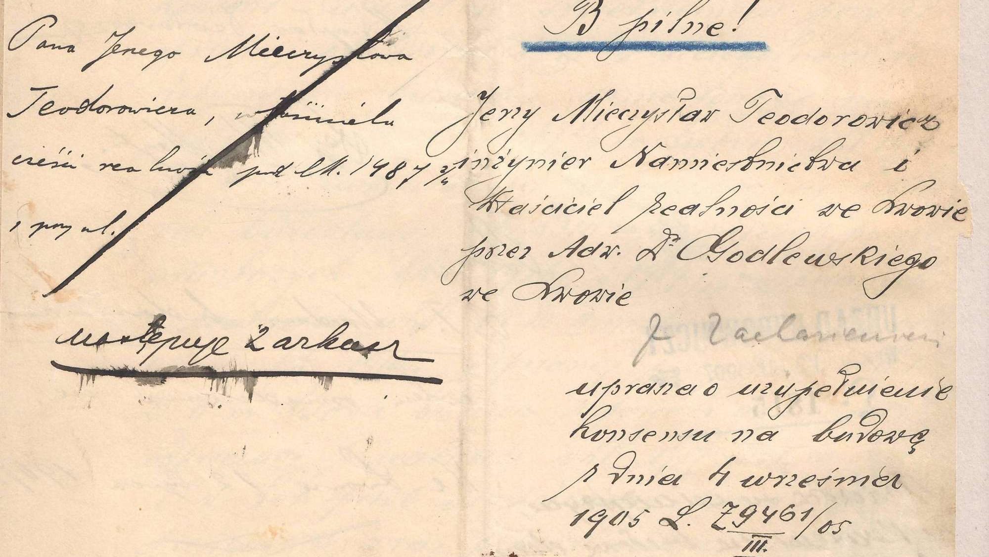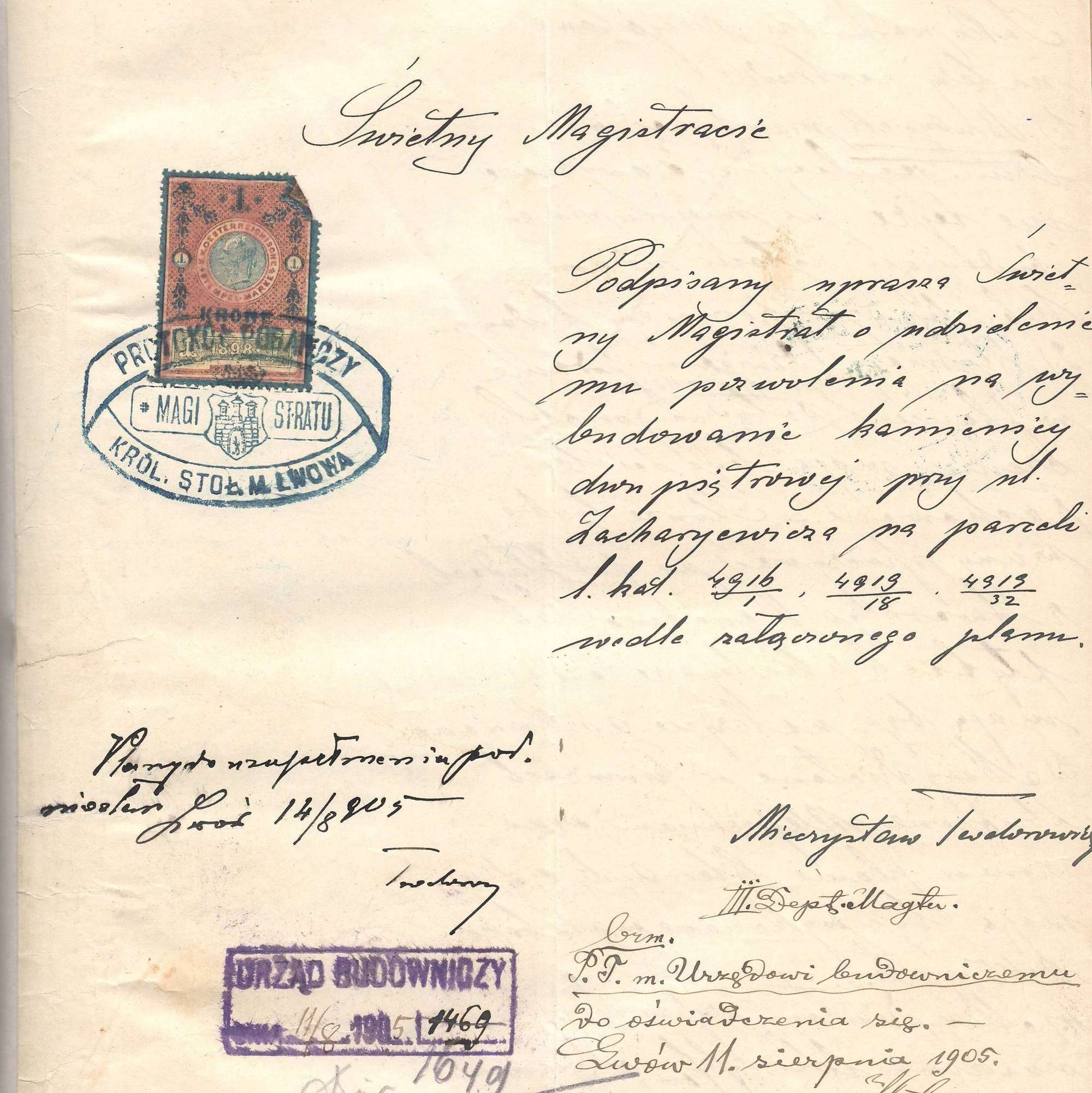 У 1905 р. до Магістрату королівського міста Львова надходять два звернення з проханням надати дозволи на будівництво кам’яниць згідно поданих планів. Перша заява такого змісту надходить 11 серпня від Мечислава Теодоровича.