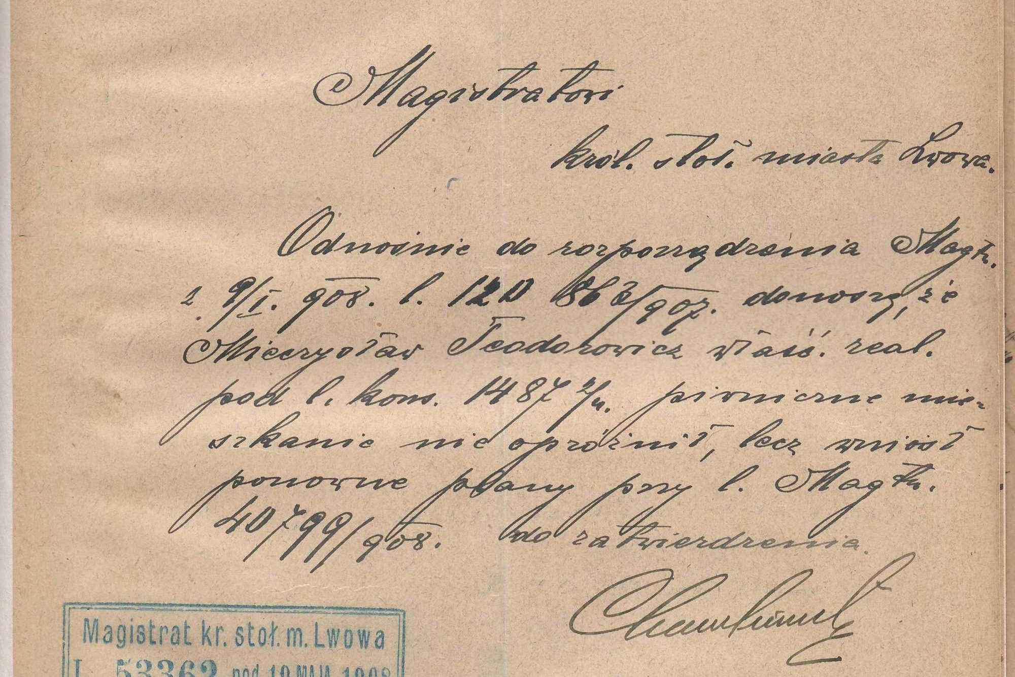 Так, 11 жовтня 1906 р. Магістрат надає дозвіл на заселення будинку під номером 7, за винятком приміщення в цоколі, призначеного для проживання сторожа, через невідповідність санітарних умов. Через місяць Комісаріат 2-ої дільниці м. Львова повідомляє Магістрату, що М. Теодорович вже з середини листопада поселив сторожа у цокольне приміщення, мало того – облаштував там ще одне помешкання.