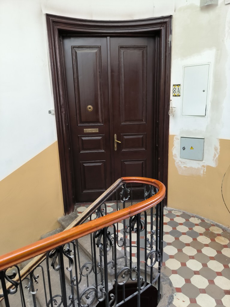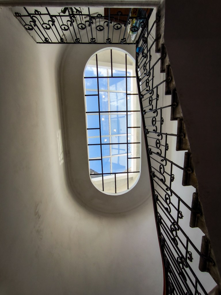 Нам пощастило також побувати в інтер’єрі 7 будинку. Тут збереглося чимало автентики: плитка-шахівниця стриманих біло-сіро-бордових тонів, ковальство балюстради сходів, ґратки на віконцях, призначених для освітлення вбиралень, дерев’яні двері з поштовими скриньками та вічками. Сходова клітка легко заокруглена та чудово освітлена, адже зверху над нею знаходиться світловий ліхтар, що повторює її овальну форму.