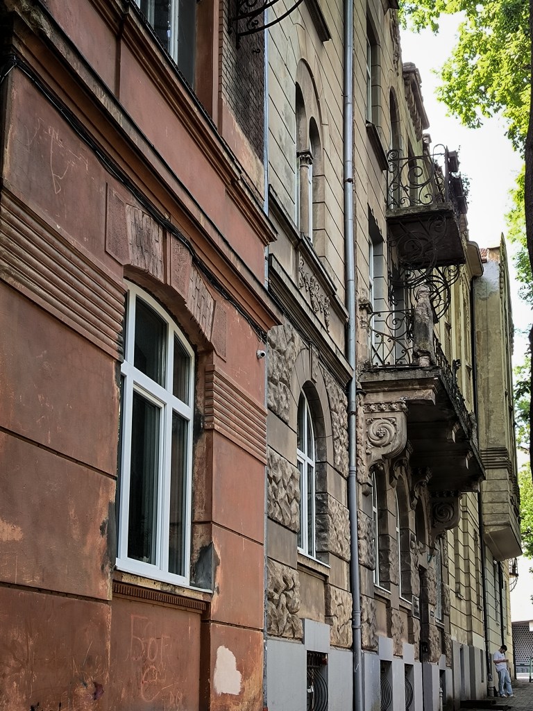 Подібні, до речі, можемо побачити у курдонері Александра Вартересєвича на вул. І. Франка, 50. Хтозна, можливо А. Вартересєвич був причетний до проєкту цього фасаду, але ще не мав концесії самостійного архітектора, аби поставити власний підпис… Сецесійні мотиви тут присутні у ковальстві балюстрад балконів. Проєкти фасадів будинків 3 і 5 підписані Альфредом Захарєвичем і Тадеушем Обмінським.